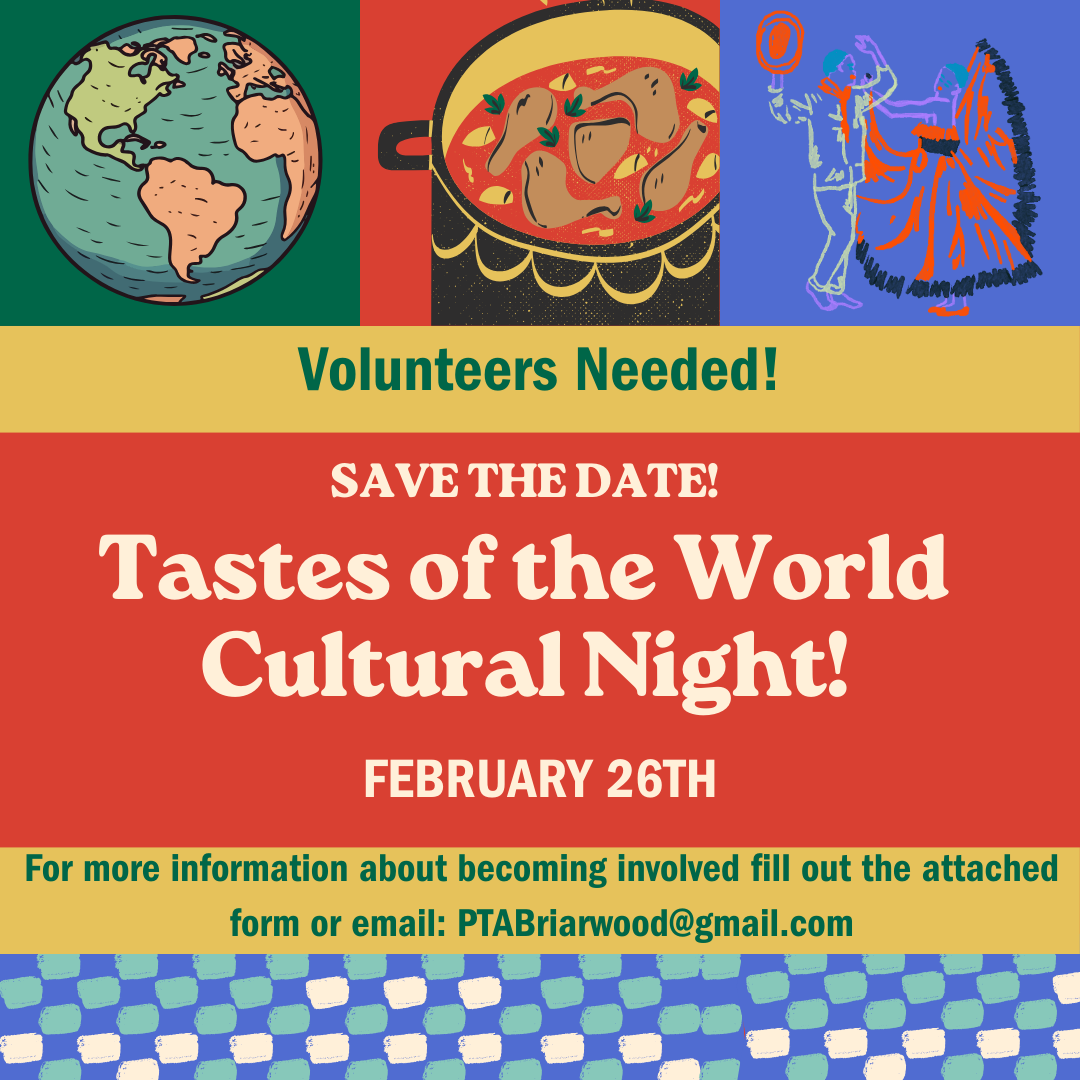Save the date! We are excited to announce that the “Tastes of the World” multicultural event will be on Feb 26th this year! It was such a fun event last year and we hope that many of you can attend again this year.